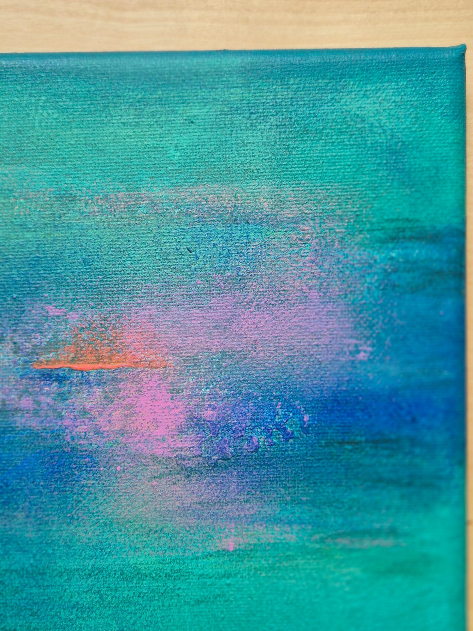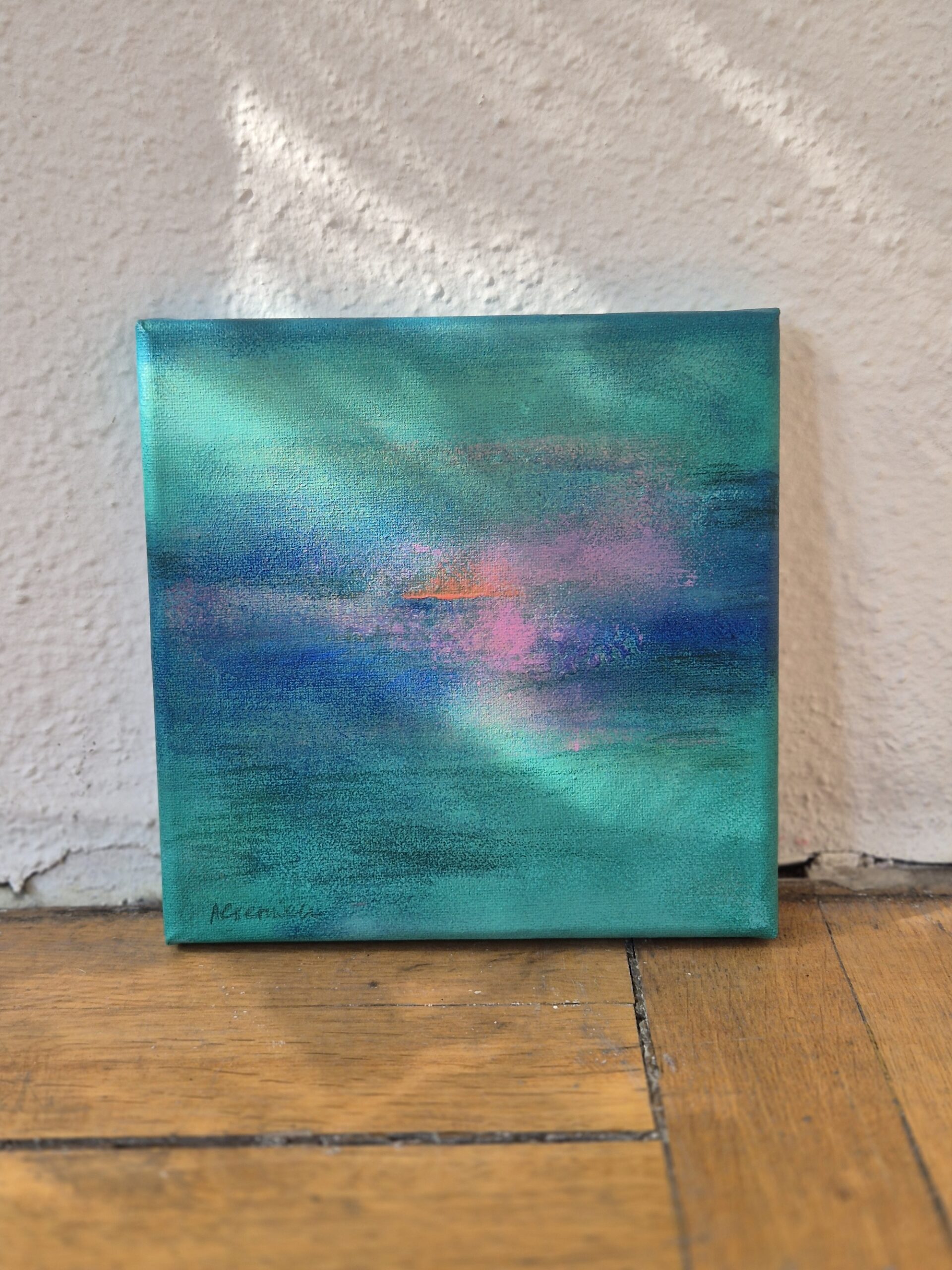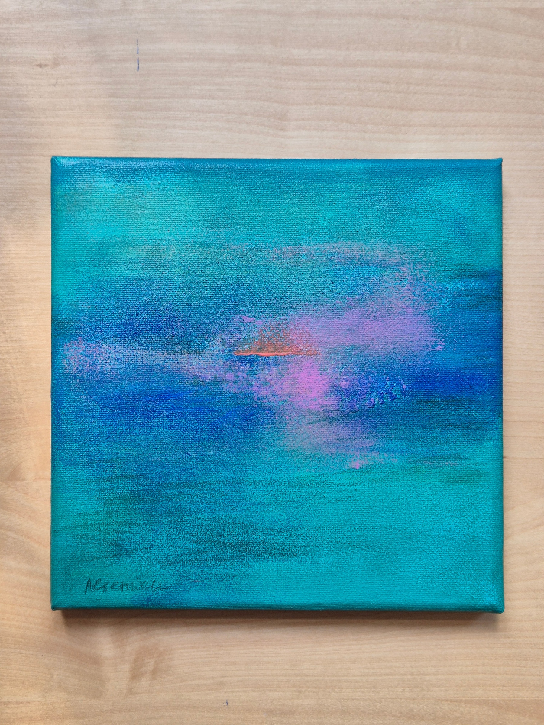 Zaczęłam malować ten obraz w lutym 2025, a potem do niego wróciłam w maju. Pracowałam wtedy nad kilkoma obrazami na raz - to jeden z 4 drobnych obrazów, które pomogły mi zachować "flow" gdy czekałam, aż większy obraz wyschnie.