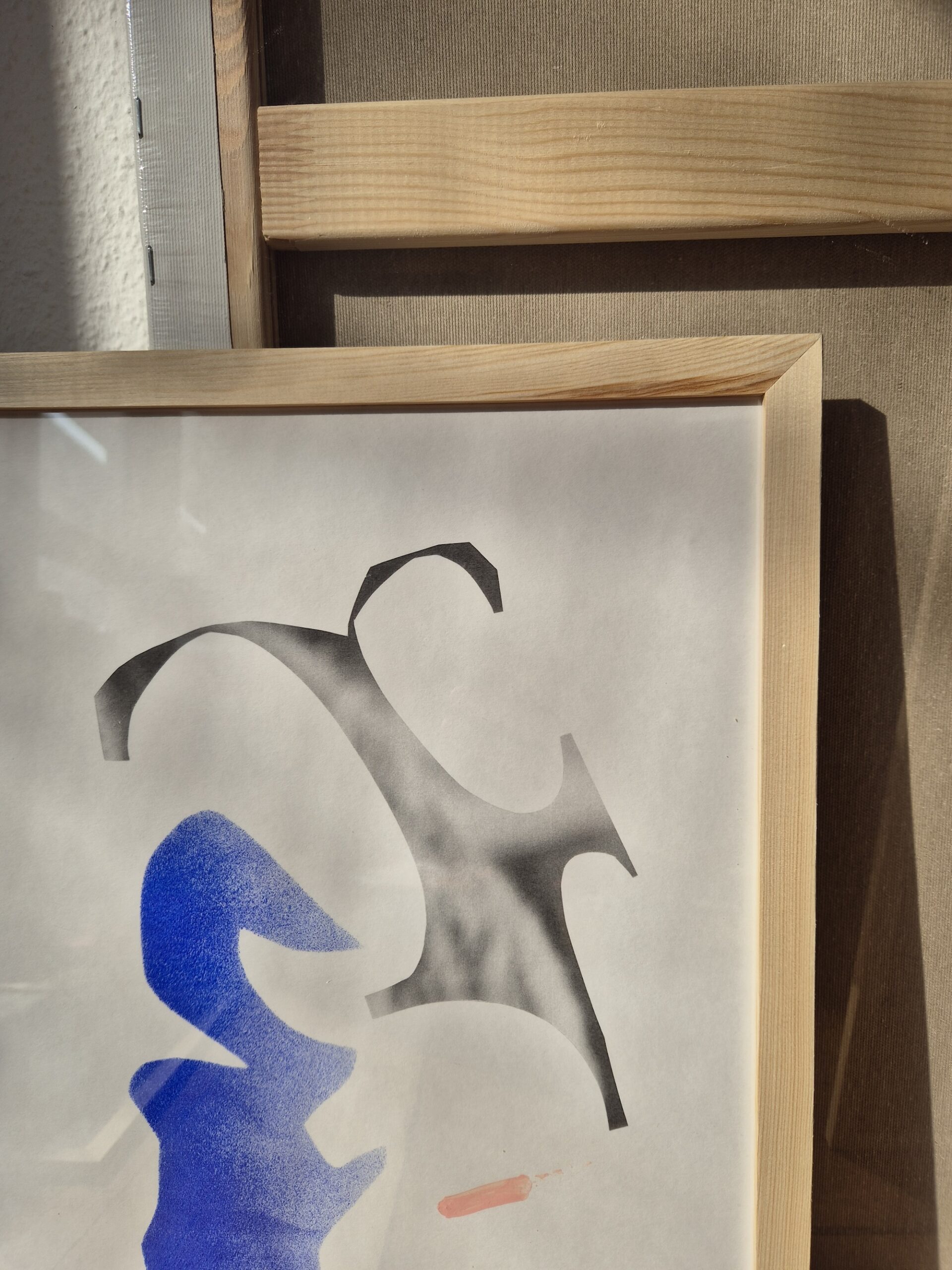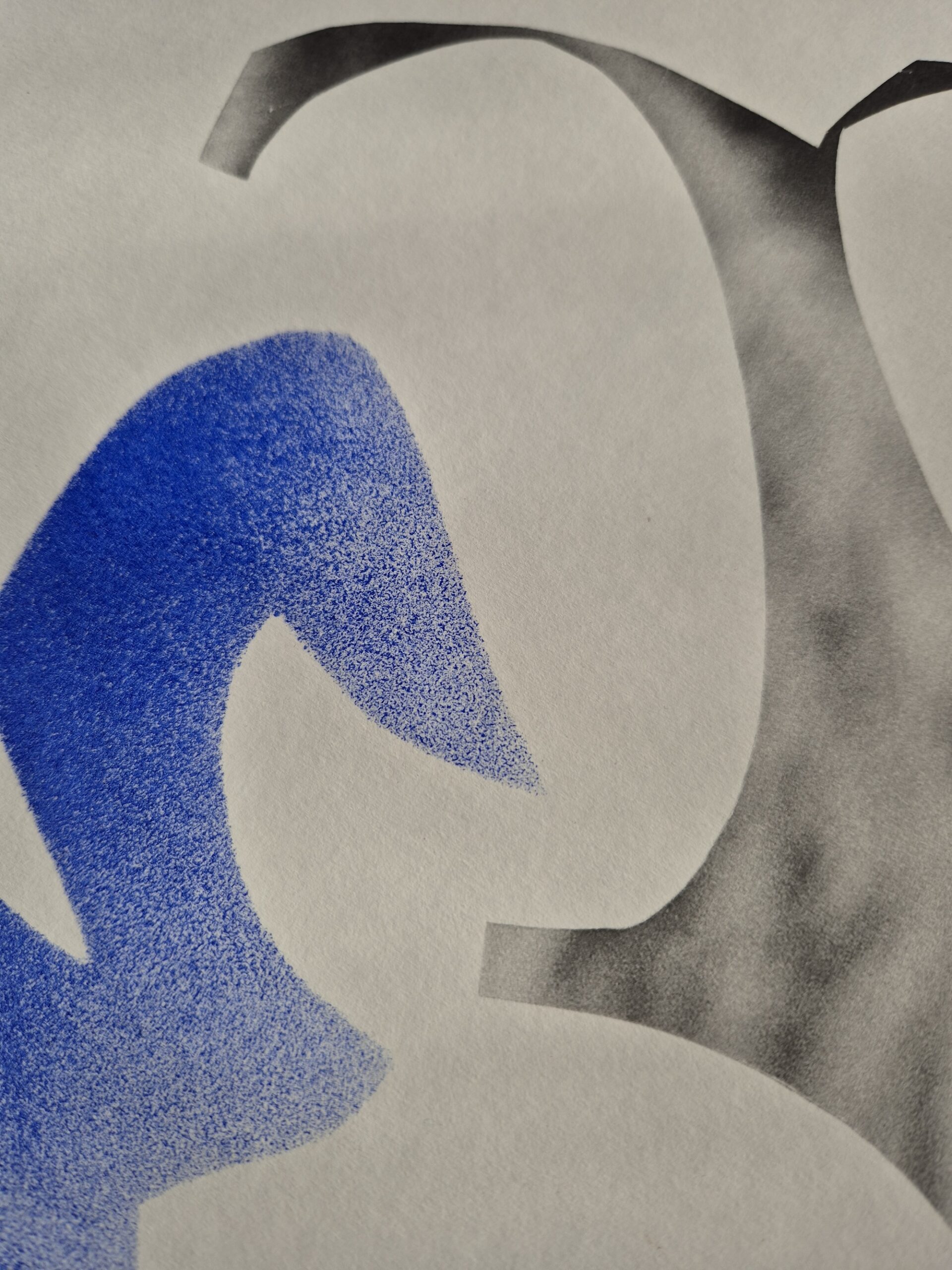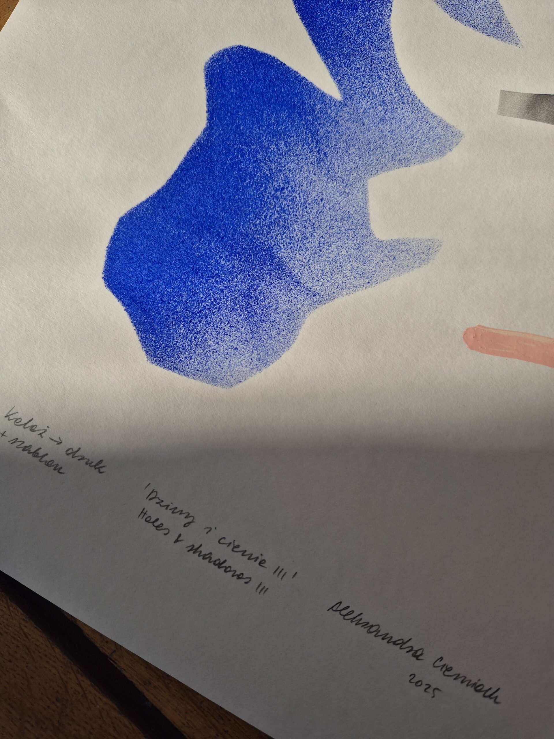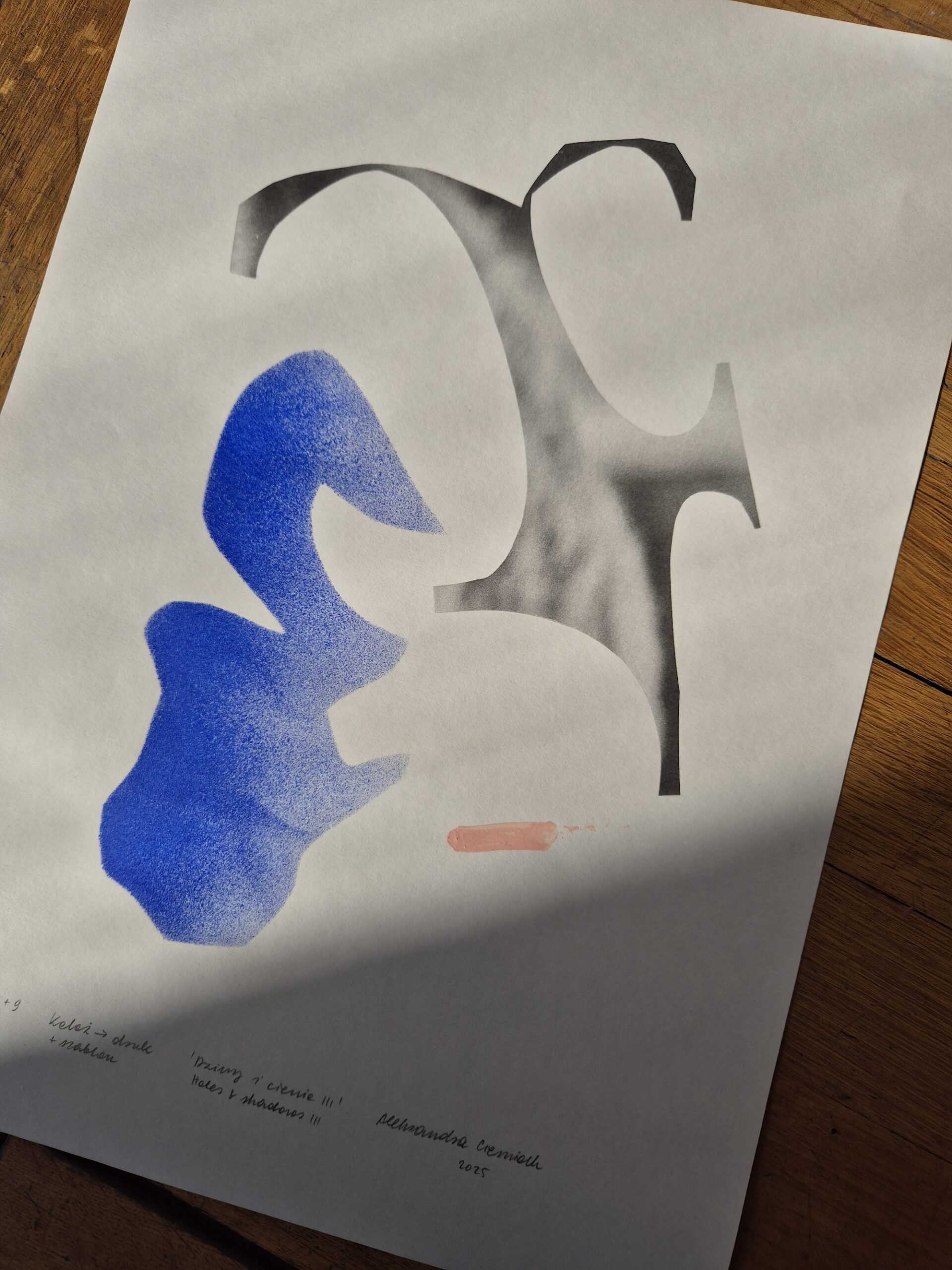 Grey and black parts are digital prints from hand-cut collage – the parts of the photos between the pieces that I needed for something else; blue parts are hand-painted with stencils (left out holes); pink marks are hand-painted.