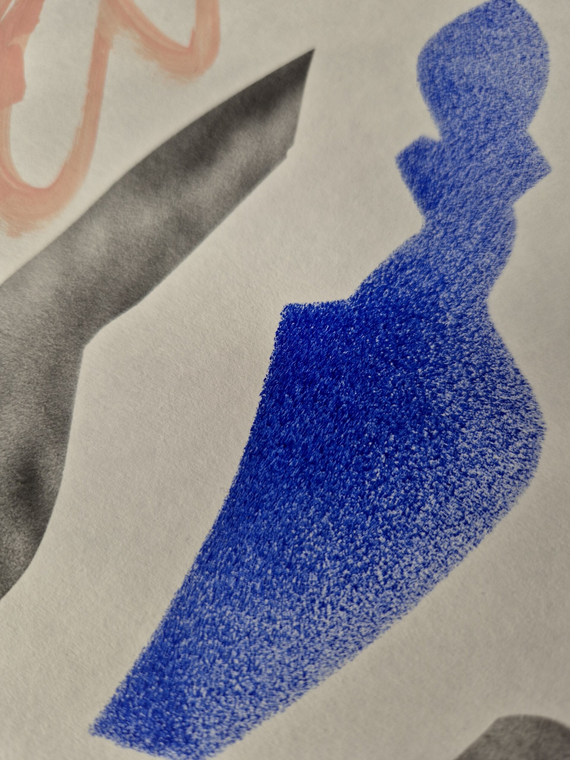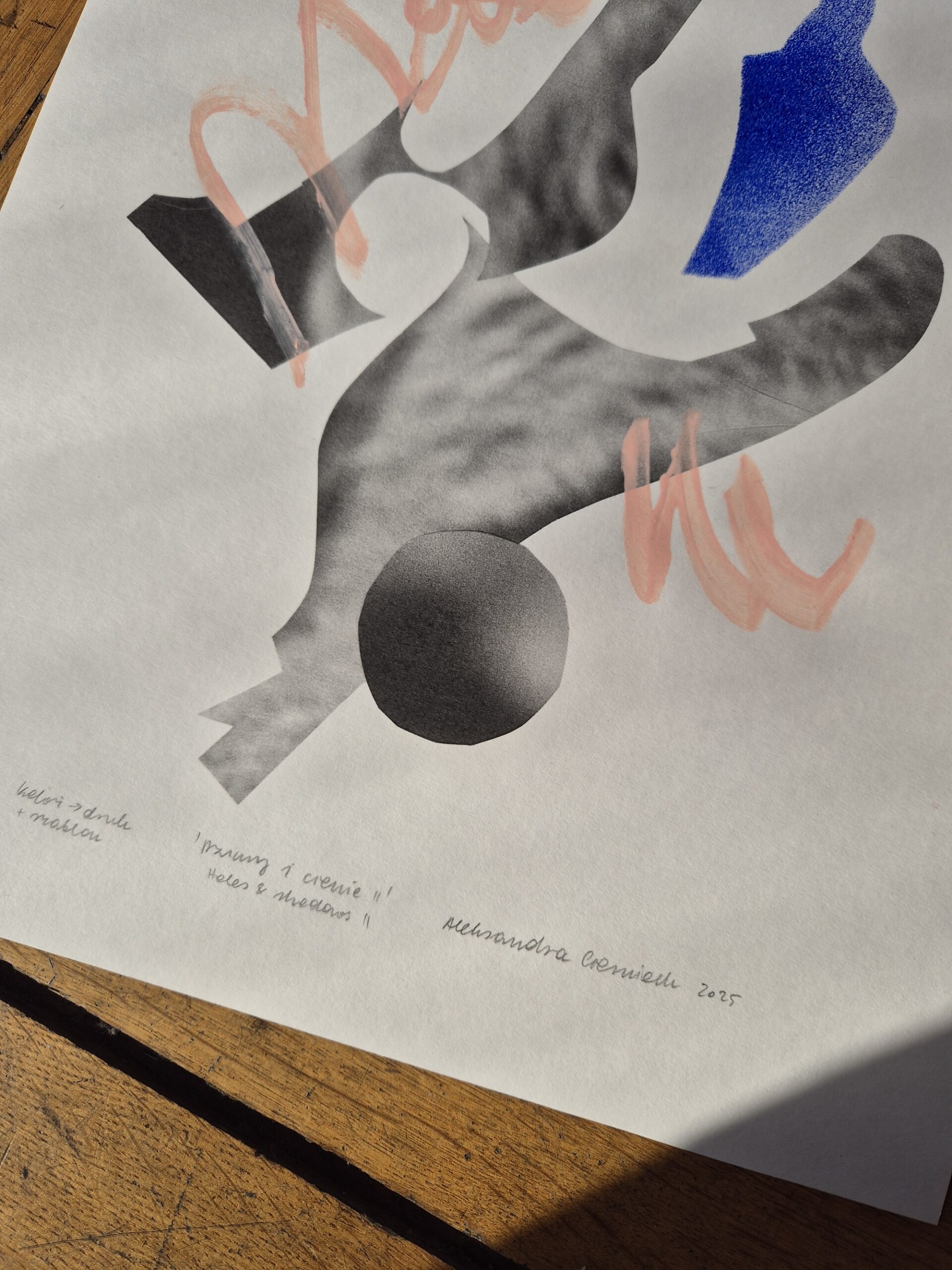 Grey and black parts are digital prints from hand-cut collage – the parts of the photos between the pieces that I needed for something else; blue parts are hand-painted with stencils (left out holes); pink marks are hand-painted.